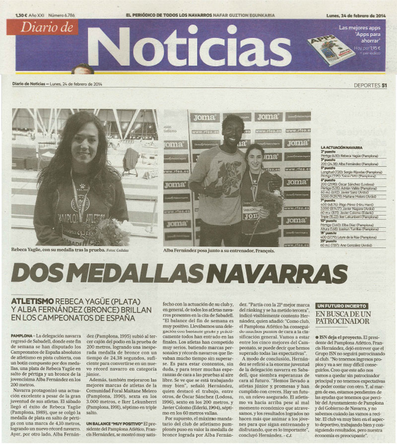 La atleta júnior del Club Pamplona Atlético, Alba Fernández Nuin, que figura en el programa "Jóvenes Talentos" de esta Fundación, consiguió el pasado fin de semana la medalla de bronce en el 50º Campeonato de España Absoluto en Pista Cubierta. Además, batió tres veces el récord navarro de 200 mts. lisos de su categoría.