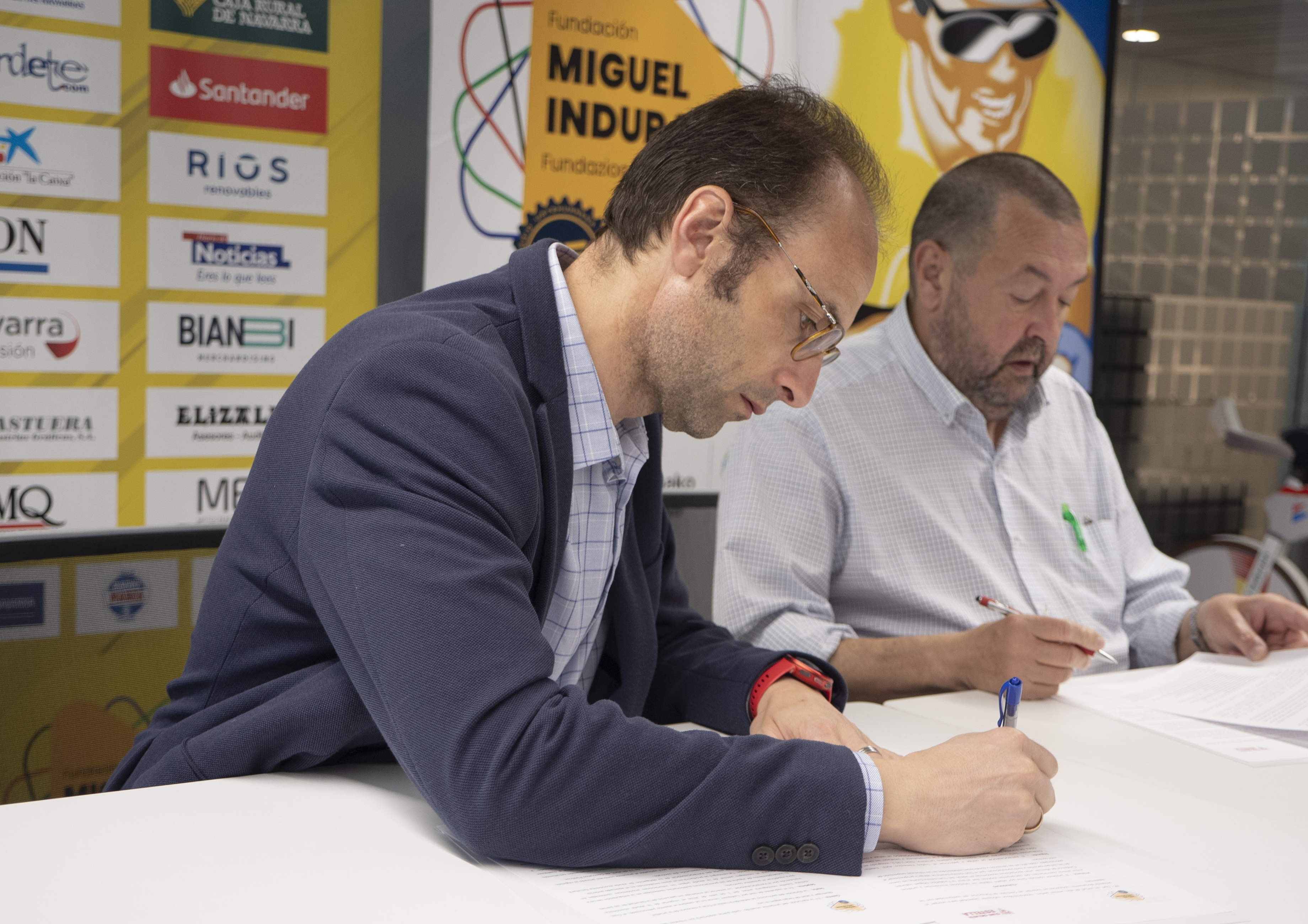 Jorge Aguirre Oviedo, director-gerente del INDAF y presidente del comité Ejecutivo de la FMIF, y Miguel Ángel García Michelena, presidente del Club Ciclista Estella-Lizarra Txirrindulari Elkartea, han firmado esta mañana el convenio de patrocinio para la organización del “III Trofeo Femenino Ayuntamiento Estella-Emakumeen III Saria Lizarrako Udala, especialidad ciclismo en carretera, integrado en la Copa de España para féminas, que se celebrará el fin de semana del 8-9 de junio, en la línea del compromiso de la Fundación por dar visibilidad al deporte femenino.
