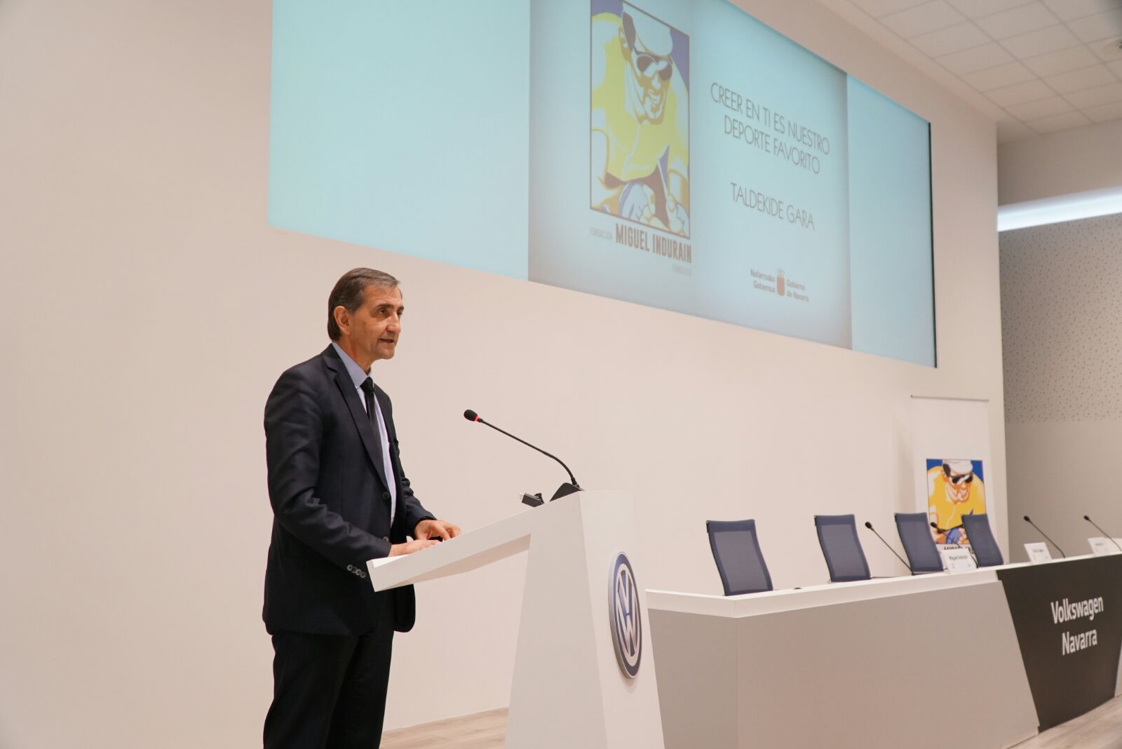 La presentación del nuevo spot ha tenido lugar en la planta de Volkswagen Navarra (uno de los patrocinadores de Fundación Miguel Induráin Fundazioa), con la presencia de la consejera de Cultura, Deporte y Juventud, Ana Herrera, junto a Miguel Induráin, presidente de honor de la Fundación, Rubén Goñi, director gerente del Instituto Navarro de Deporte y Juventud, y Emilio Sáenz, presidente de Volkswagen en Navarra.