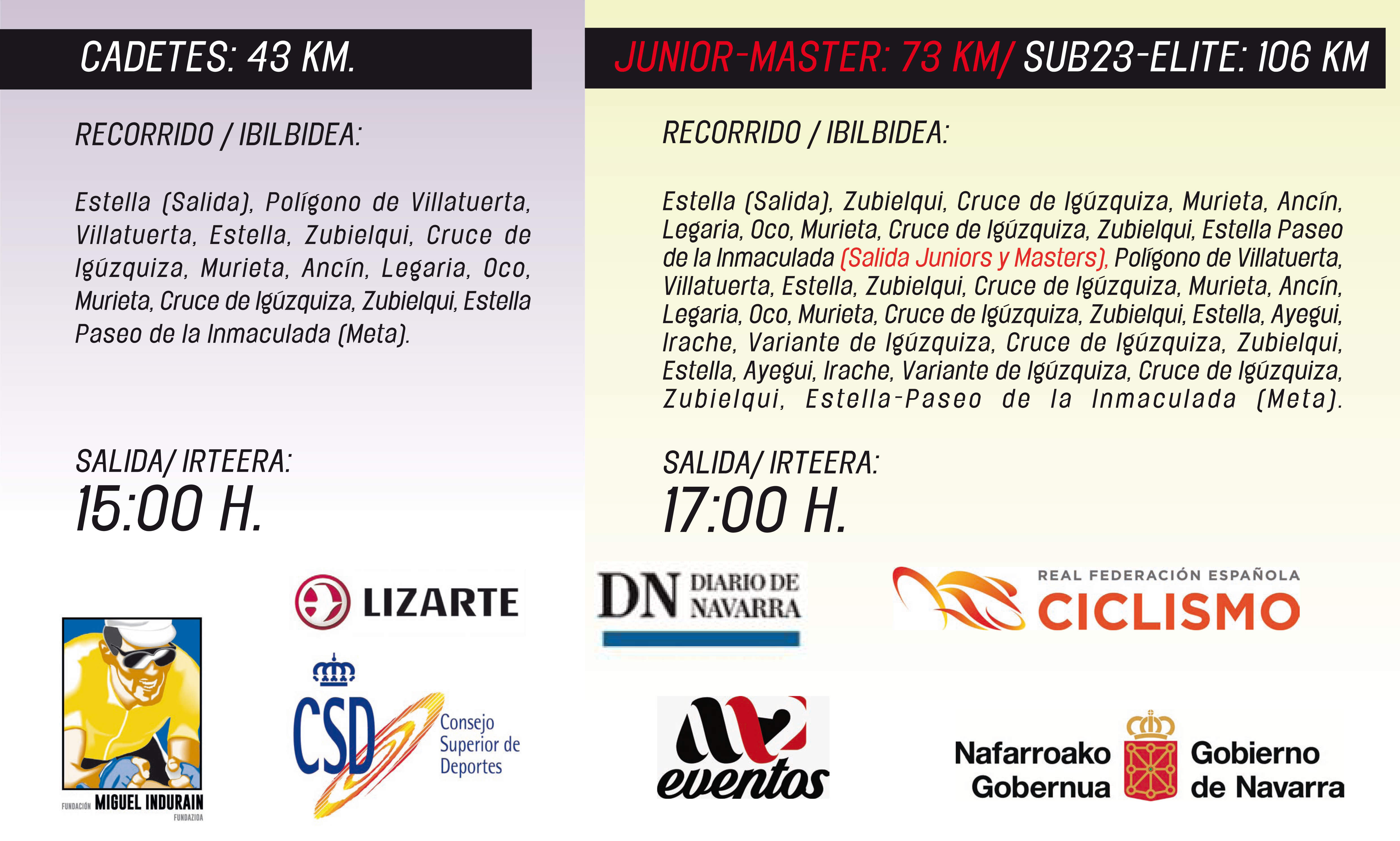 Con salida y meta en la ciudad del Ega el presente y futuro del ciclismo femenino rodará por nuestras carreteras ofreciendo un prometedor espectáculo. Las ciclistas de categoría cadete recorrerán una distancia de 43 kilómetros, las júnior y máster 73 y 106 las sub23 y élite.
