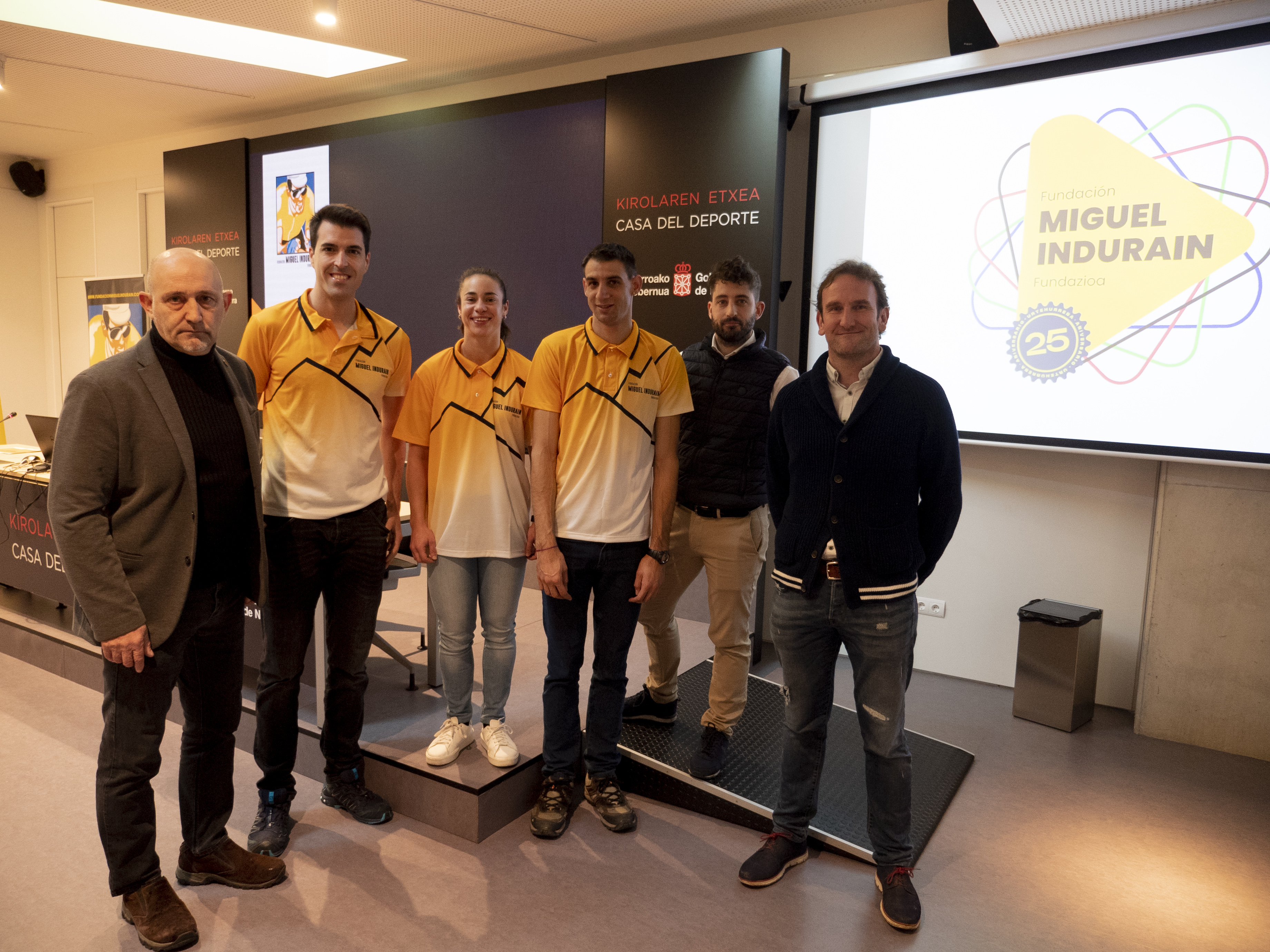 La actividad esta mañana en la sala de prensa de la Casa del Deporte ha sido muy intensa ya que, además del calendario, se ha aprovechado el encuentro con los medios de comunicación para presentar el nuevo logo conmemorativo del 25ª aniversario de la Fundación Miguel Induráin Fundazioa, que se va a celebrar durante todo el año 2023.